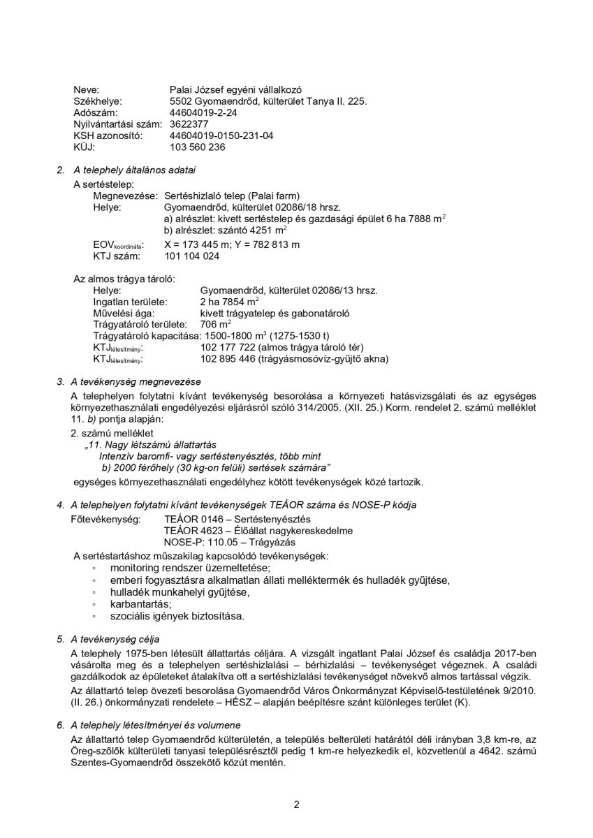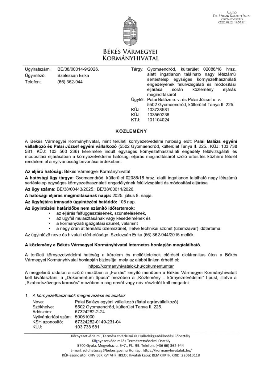Tájékoztatjuk a lakosságot a Gyomaendrőd, külterület 02086/18 hrsz. alatti ingatlanon található nagy létszámú sertéstelep egységes környezethasználati engedélyének felülvizsgálati és módosítási eljárásáról.